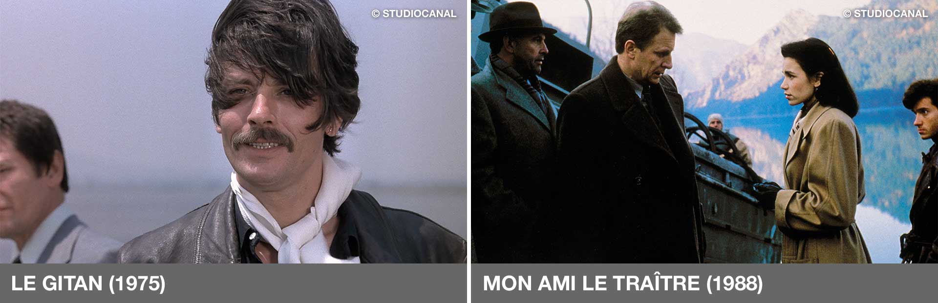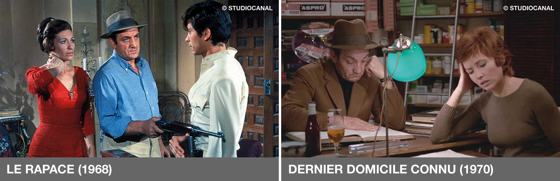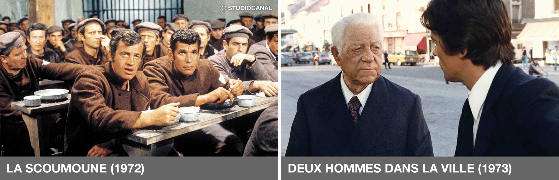 Worthy of note among the fifteen feature films he helmed, as well as two films for television and three episodes of a couple of series, are Le Rapace / Birds of Prey (1968), Dernier domicile connu / Last Known Address (1970) —both with Ventura— Un aller simple / One Way Ticket (1971), La Scoumoune / Hit Man (1972) —with Belmondo, Claudia Cardinale and Giovanni’s actor fetiche, Michel Constantin— Deux hommes dans la ville / Two Men in Town (1973) —with Delon and Gabin co-starring in the film—, Le Gitan / The Gypsy (1975) —produced and played by Delon— and Une robe noire pour un tueur (1981), with Annie Girardot. In his last two films, Mon ami le traître / My Friend the Traitor (1988) and Mon père, il m’a sauvé la vie / My Father Saved My Life (2001)—cowritten with Bertrand Tavernier— he took to fiction to reflect on the decisive aspects that had marked his own life.