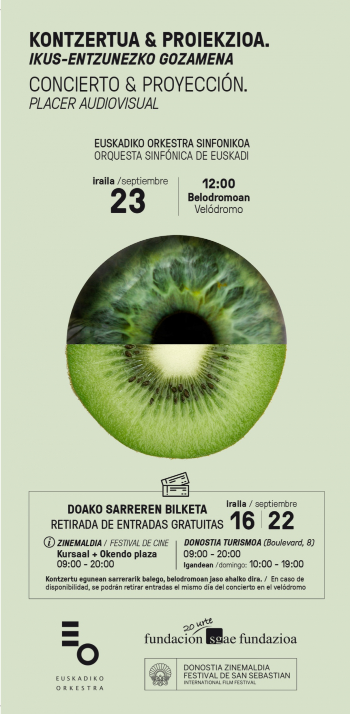 The Basque National Orchestra, the SGAE Foundation and the San Sebastian Festival present the concert of film music performed by the Basque Orchestra in the framework of the Festival. Also this year, on the first Saturday of the Festival, the Velodrome will open at midday to music lovers, movie buffs and the general public in an event combining a symphony performance with soundtracks and a selection of scenes from the films in which they can be heard. Ninety minutes of “audiovisual pleasure”, on Saturday September 23 at 12 midday. Admission free.