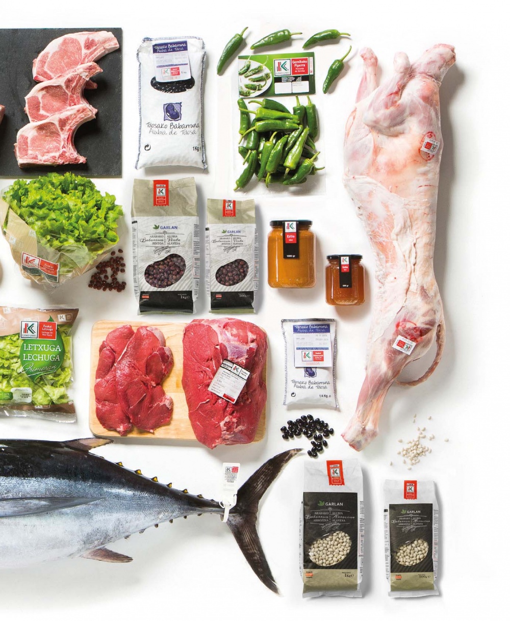 Carne de Vacuno del País Vasco, Pollo de Caserío Vasco, Cordero Lechal del País Vasco, Cerdo de Caserío, Bonito del Norte y Atún Rojo, Huevo de Caserío Vasco, Leche del País Vasco, Miel, Patata de Álava, Pimiento de Gernika, Tomate del País Vasco, Verduras del País Vasco, Guindillas de Ibarra, Legumbres del País Vasco, Aceite de Oliva Virgen Extra, Cereales de Álava, Antxoa y Sal de Manantial de Euskadi.
