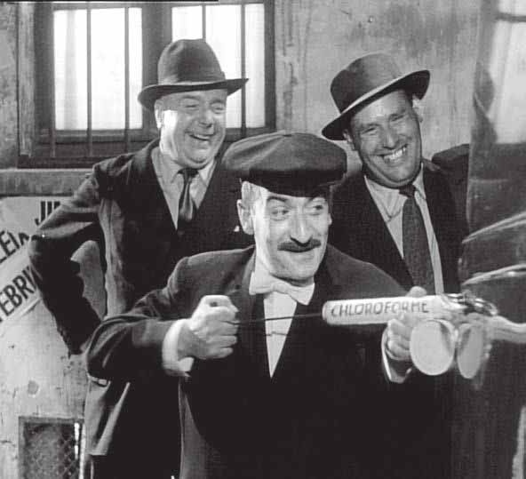 Ya en Monte Marino, los enredos se encadenan y precipitan a la velocidad del rayo y bajo la consigna del disparate: Bonjour sourire! (1956) es toda ella excentricidad, histeria, crispación, griterío y gesticulación paroxística. Los cinco secuestrados hacen el payaso de manera harto exagerada (que no deja de tener a ratos su gracia: Henri Salvador dialogando con el hombre invisible está divertidísimo), pero no están solos, tienen un duro rival en el reparto: Louis de Funès, todavía no encumbrado pero ya un manojo de tics y muecas, con una capacidad extraordinaria para robar el protagonismo a quien en teoría le corresponde, verbigracia la escena de la boda, hacia el final, y su progresiva exhibición de nervios incontrolables ante el tartamudeo del maestro de la ceremonia: los dos comparten el mismo plano, pero es el que no habla (De Funès) quien acaba imponiendo la hilaridad.