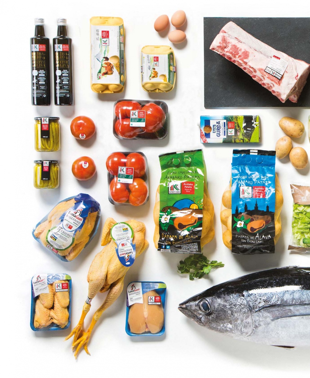 Carne de Vacuno del País Vasco, Pollo de Caserío Vasco, Cordero Lechal del País Vasco, Cerdo de Caserío, Bonito del Norte y Atún Rojo, Huevo de Caserío Vasco, Leche del País Vasco, Miel, Patata de Álava, Pimiento de Gernika, Tomate del País Vasco, Verduras del País Vasco, Guindillas de Ibarra, Legumbres del País Vasco, Aceite de Oliva Virgen Extra, Cereales de Álava, Antxoa y Sal de Manantial de Euskadi.