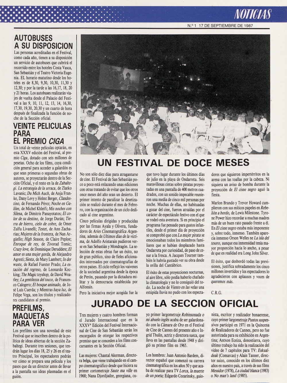 El 17 de septiembre de 1987 se publicó este artículo en la revista del Festival: “Un festival de 12 meses”; ya lo predijeron 36 años antes. ¿Puede ser que la línea del tiempo tampoco sea una línea recta, sino un loop, compuesto por ciclos y círculos concéntricos, en los que volvemos una y otra vez sobre los mismos conceptos? ¿Es que va el ser humano montado en una especie de montaña suiza que funciona hacia atrás?