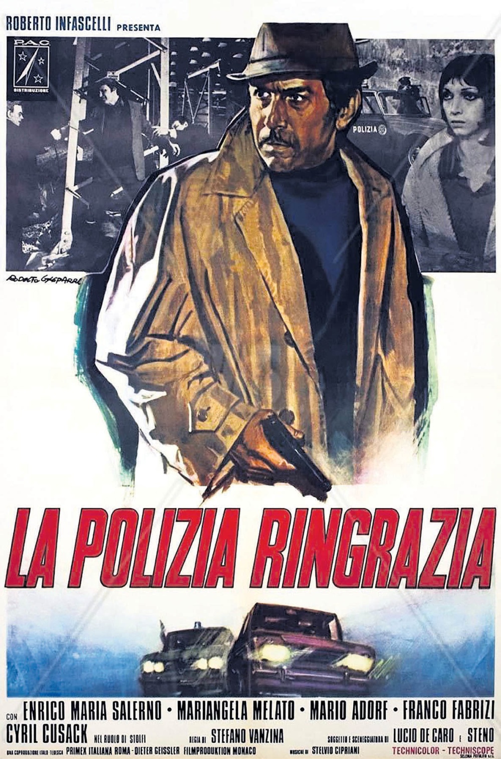 Antes film de tesis que relato de acción (aunque contenga alguna secuencia tan concisa e impactante como la persecución entre un coche patrulla y la moto del secuestrador), La policía agradece conduce a un mensaje final desolador: el fascismo encuentra terreno fértil en los errores de la justicia, y toda rebelión ante aquel está abocada al fracaso. El film, ciertamente seco y robusto, con una inolvidable banda sonora de Stelvio Cipriani y un reparto de secundarios competente (Mario Adorf, Franco Fabrizi, Mariangela Melato, Laura Belli), supuso todo un imprevisto éxito comercial, por lo cual Steno volvería tangencialmente al género, aunque ya dentro de la comedia, con El Super Poli (1973), con protagonismo de Bud Spencer, y Giovana la incorruptible (1974), con la citada Melato. Salerno también deviene divo del filón con, entre otras, La polizia è al serviczio del cittadino? (1973), de Romolo Guerreri, y La polizia sta aguardare (1973), de Roberto Infrascelli.