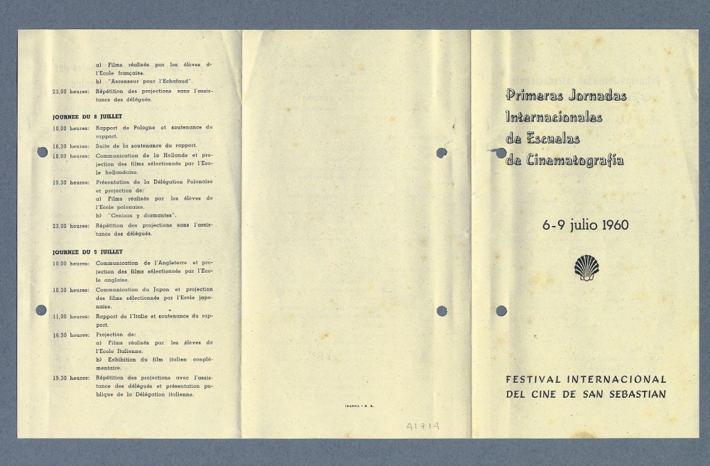 El archivo del Festival conserva el programa de mano de aquellos encuentros, que recoge las diferentes actividades que se llevaron a cabo durante cuatro días. Estas primeras jornadas reunieron a las delegaciones de las Escuelas de Cinematografía de España, Francia, México, Polonia, Holanda, Italia, Bélgica y Japón y agrupaba las proyecciones de las películas realizadas por sus alumnos y otras proyecciones de cineastas profesionales, como ¡Bienvenido, Míster Marshall! de Luis García Berlanga, que se proyectó en San Sebastián por primera vez tras su estreno en Cannes en 1953.