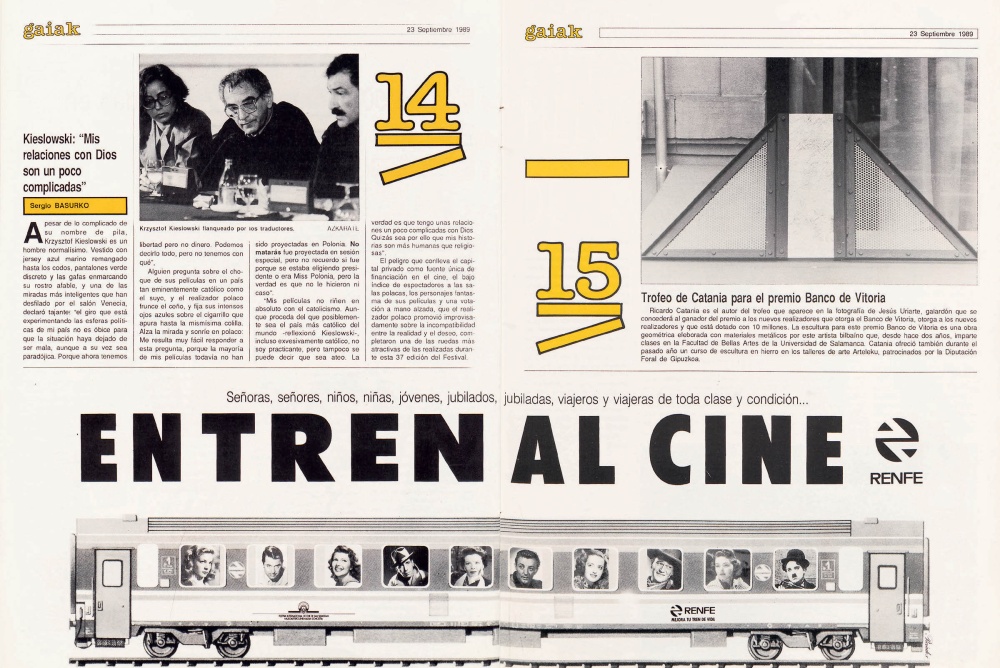 Tal y como podemos comprobar en este banner publicitario incluido en el diario del Festival en el año 1989, Renfe fue, según sus propias palabras, patrocinador de las proyecciones Magnapax en el Velódromo de Anoeta y transportista particular de miles y miles de escolares. Un documento gráfico conservado en el archivo del Festival que permite comprobar cómo el certamen y la compañía ferroviaria ya habían unido fuerzas en el pasado. Ya entonces Renfe animaba a “señores, señoras, niños, niñas, jubilados, viajeros y viajeras de toda clase y condición” a ir en tren al cine.