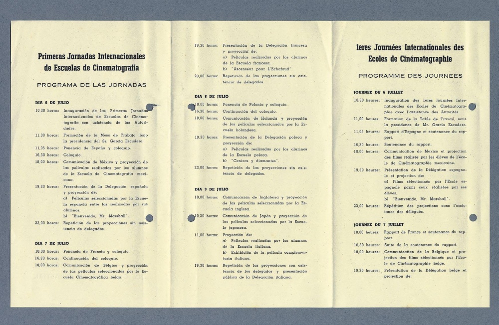 El archivo del Festival conserva el programa de mano de aquellos encuentros, que recoge las diferentes actividades que se llevaron a cabo durante cuatro días. Estas primeras jornadas reunieron a las delegaciones de las Escuelas de Cinematografía de España, Francia, México, Polonia, Holanda, Italia, Bélgica y Japón y agrupaba las proyecciones de las películas realizadas por sus alumnos y otras proyecciones de cineastas profesionales, como ¡Bienvenido, Míster Marshall! de Luis García Berlanga, que se proyectó en San Sebastián por primera vez tras su estreno en Cannes en 1953.