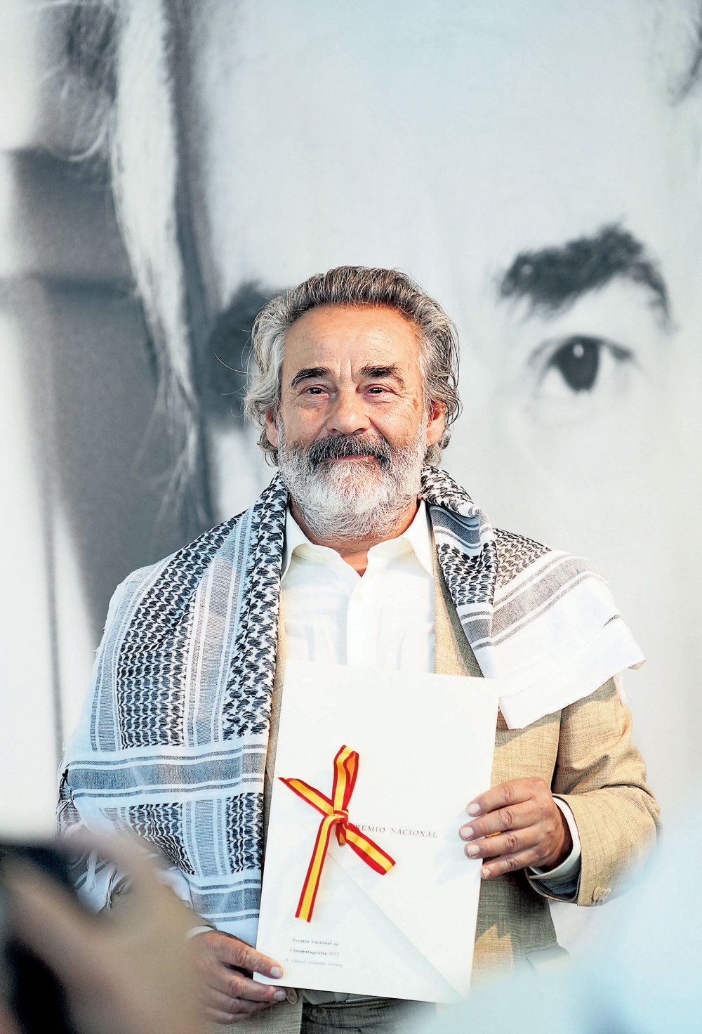 Tabakalera acogió ayer el acto de entrega del Premio Nacional de Cinematografía 2025 dentro del marco del Festival. Eduard Fernández recibió el premio de manos del ministro de Cultura, Ernest Urtasun. En su intervención, además de agradecer el galardón, Fernández decidió ponerse una kufiya en señal de apoyo al pueblo palestino. “Es inevitable no hablar de la barbaridad que está ocurriendo en Palestina”, proclamó.